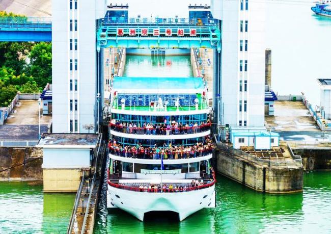 游客们齐聚甲板,仔细观看体验游轮游三峡、过船闸。(王耿摄)