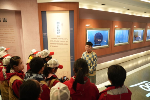 历经岁月积淀,荆楚乐舞文化之珠的光芒愈加璀璨。岁月不语,唯石能言,编钟作为中国古代大型打击乐器,被誉为众乐之首,是先秦雅乐的主体,此次博物馆研学之旅第一站在编钟厅开启。科普宣讲员详细介绍了编钟的起源、文化象征意义和编钟的构造、发声原理等乐律知识,并指导大家敲奏不同音高的编钟、编磬。编钟音阶分明、音域广阔,旋宫转调,铮铮钟声或深沉浑厚、或圆润淳朴、或清脆明快,乐韵悠扬,变幻多姿,令小记者们如痴如醉。