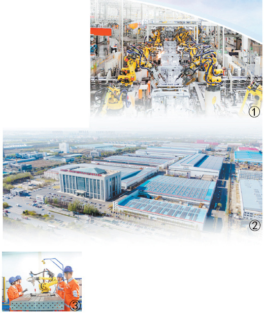 图①:长城汽车重庆永川工厂车间内景。敖民极摄(人民视觉)图②:辽宁沈阳,北方重工的光伏屋顶工厂。本报记者辛阳摄图③:湖北武汉,中铁科工集团研发人员在进行设备调试。潘万齐摄(人民视觉)