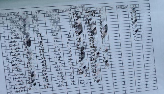在一份出院记录表上,仅在2025年12月份,就有二十多位病人办理了出院手续,然而记者核实后发现,除了个别病人是真出院外,其余病人实际都还在医院里。该科室的一名护士向记者证实,确实有一部分病人办理了出院手续,实际仍在医院,所谓出院只是“假出院”。